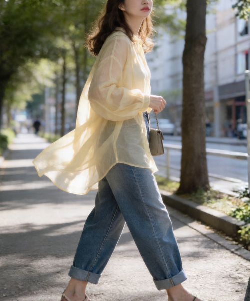 襟を立てて着られるデザインなら、カジュアルすぎず凛とした印象に。首元のUV対策にも一役買います。