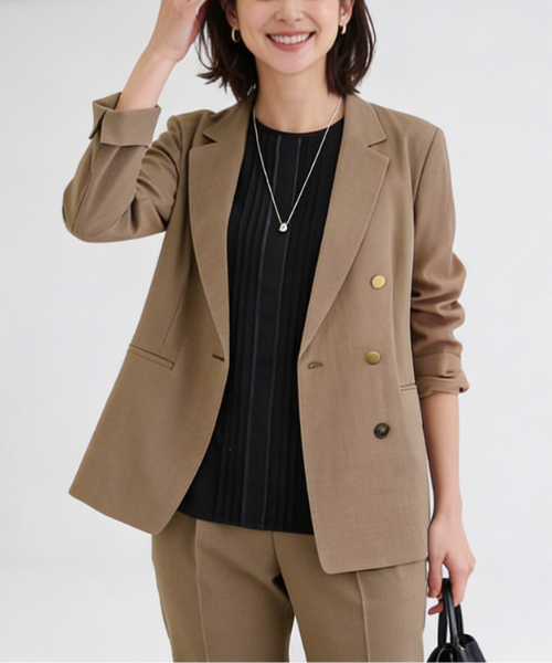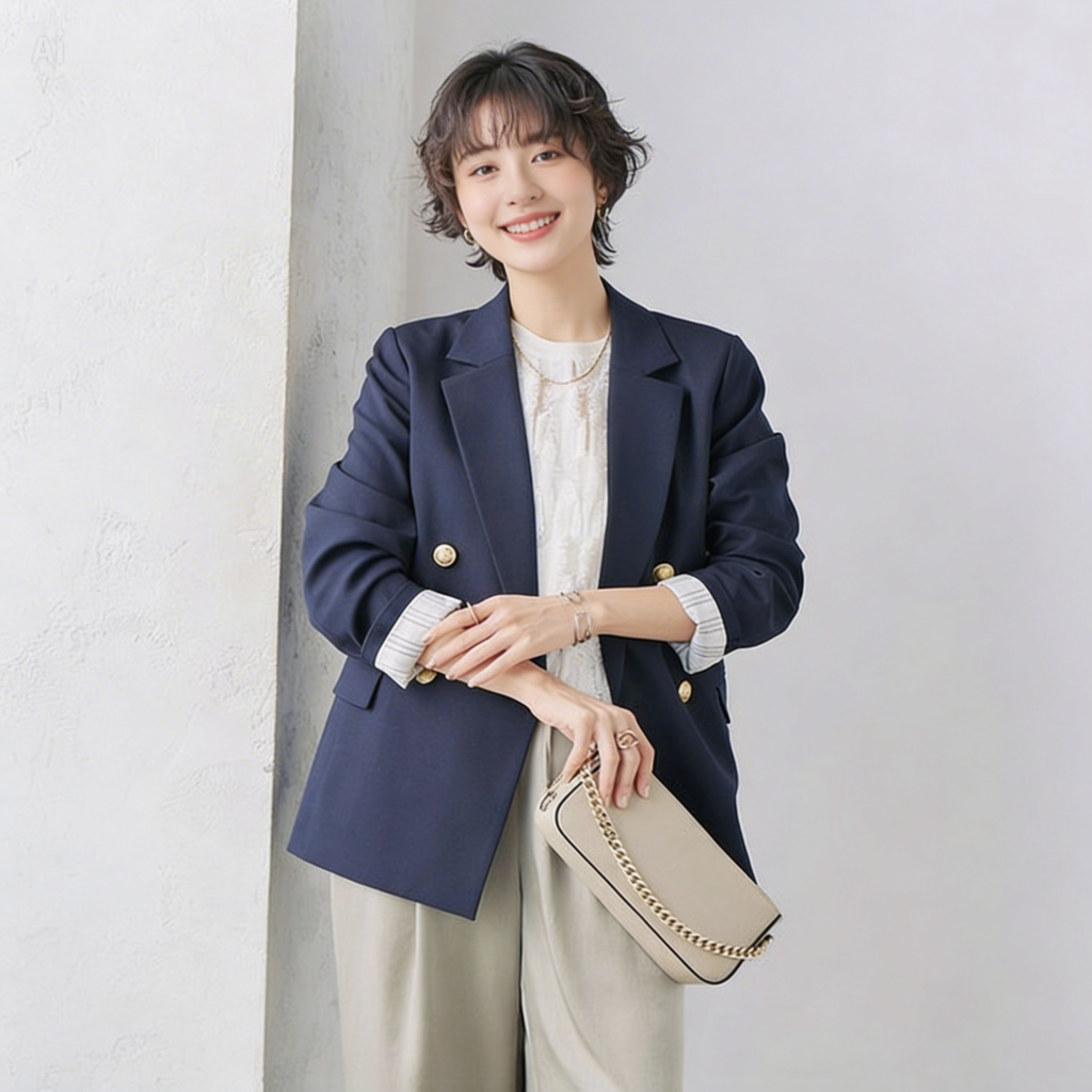 • 着こなしのコツ:あえてジャケットのボタンを開け、リネン混などの表情のある素材感を楽しむのが正解。大きめのイヤリングなど、存在感のあるアクセサリーとも好相性です。