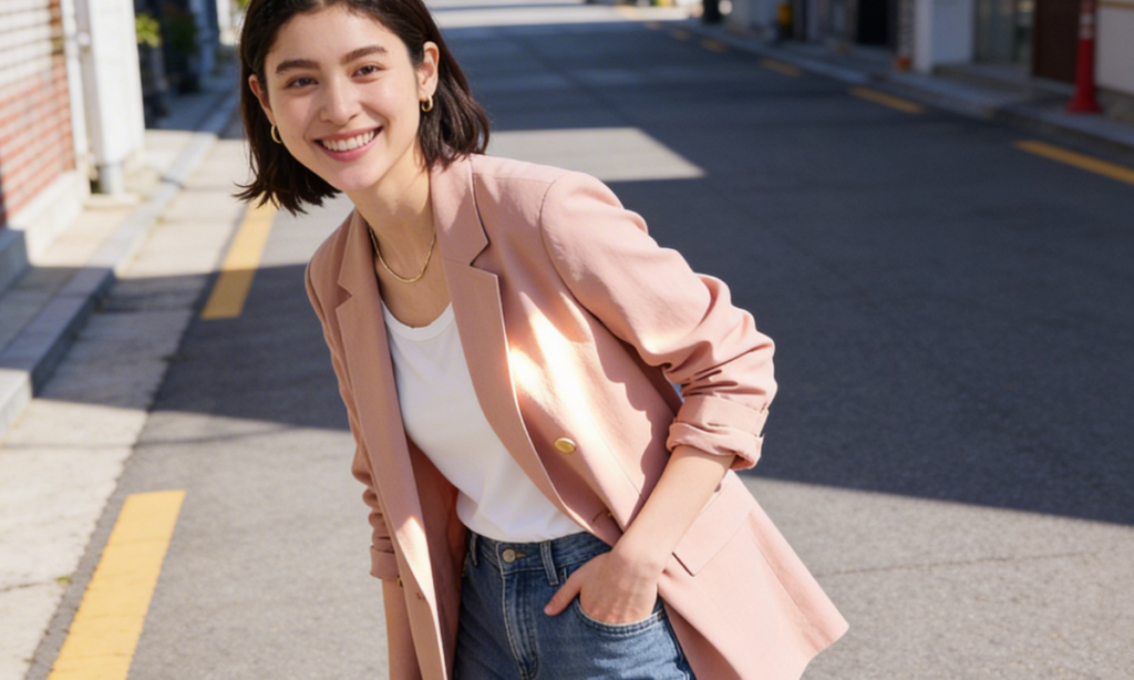 5. 金【週末ハッピーDAY】ベージュのジャケット × デニム(または白パン)。 ジャケットのボタンを外した「抜け感スタイル」で、仕事帰りのディナーへ。